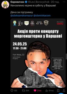 24 травня у Варшаві має відбутися концерт російського виконавця Моргенштерна (Алішера Валєєва), однак українська громада вже оголосила про намір провести в той же день акцію протесту. Метою заходу є привернення уваги до неприпустимості публічних виступів артистів із проросійськими поглядами на тлі триваючої агресії Росії проти України.